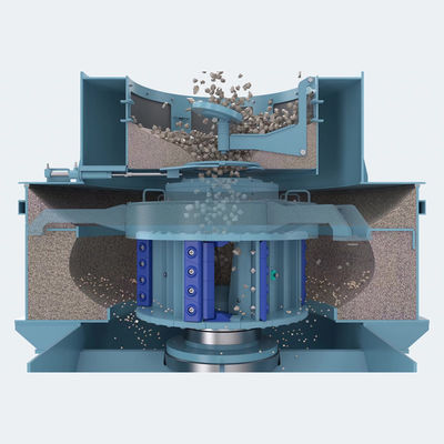 Стробитель вертикального удара серии VSI оптимизирует качество продукции посредством многоступенчатого дробивания. Материал, поступающий в дробитель, сначала входит в ротор и ускоряется до скорости 45-70 м/с.Материал, выброшенный из ротора сталкивается с материалом переполняет в дробильной камеры, достигая цели формирования материала и производства песка. путем регулирования скорости потока переполнения, скорости ротора и диаметра ротора, пропускной способности, формы агрегата,или классификация песка может контролироваться для выполнения различных технических спецификаций.